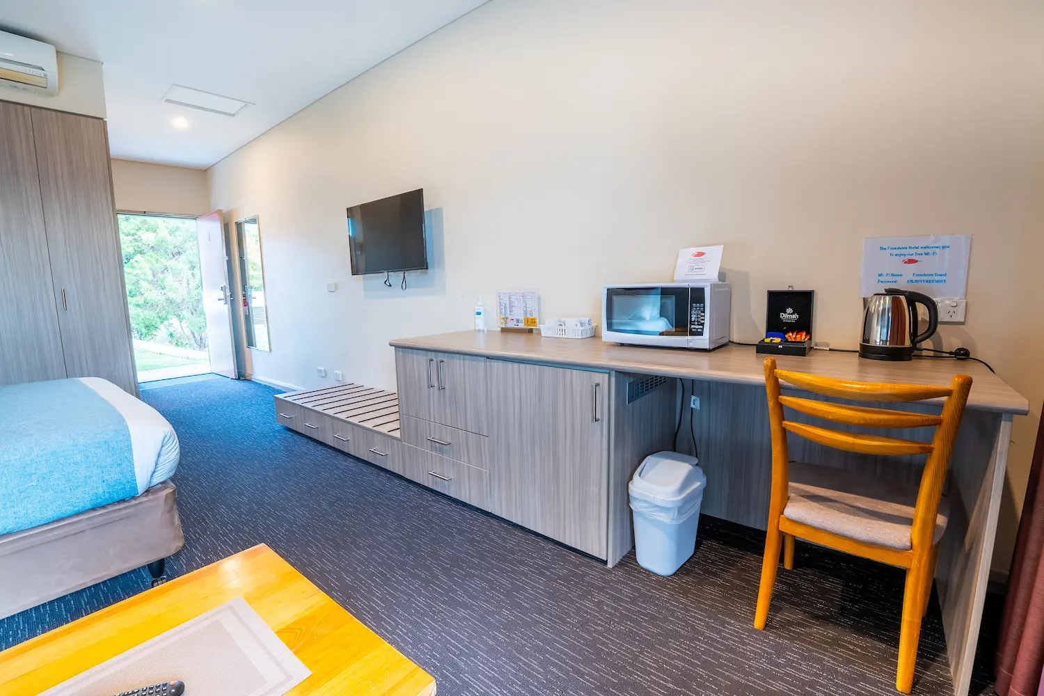 Choose from well-appointed, ground-floor rooms with parking at the door and private courtyards/patios—set up for easy, comfortable stays. Every room includes Smart TV, bar fridge, toaster, electric kettle and the essentials; air-conditioning comes standard.